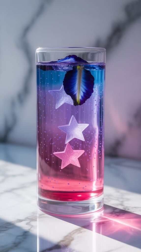 Add a drop of grenadine for a deeper pink layer at the bottom, top with edible glitter, and serve with the star ice cubes. The color-changing effect works best when you pour the lemonade slowly, rushing it blends everything together before guests can see the transformation. Let them watch it happen, that’s the whole experience.