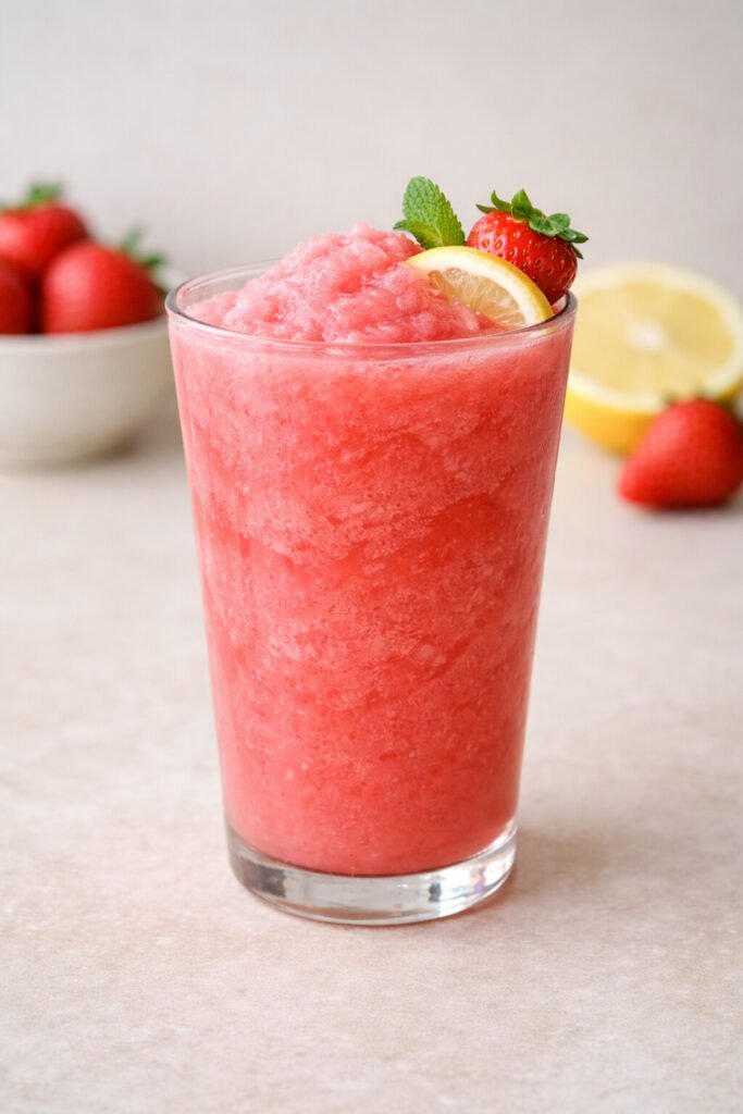 Strawberries add natural sweetness and texture, whereas lemonade adds acidity. This gives it a bright, clean, and refreshing taste, not syrupy and heavy like other frozen fruit drinks.
